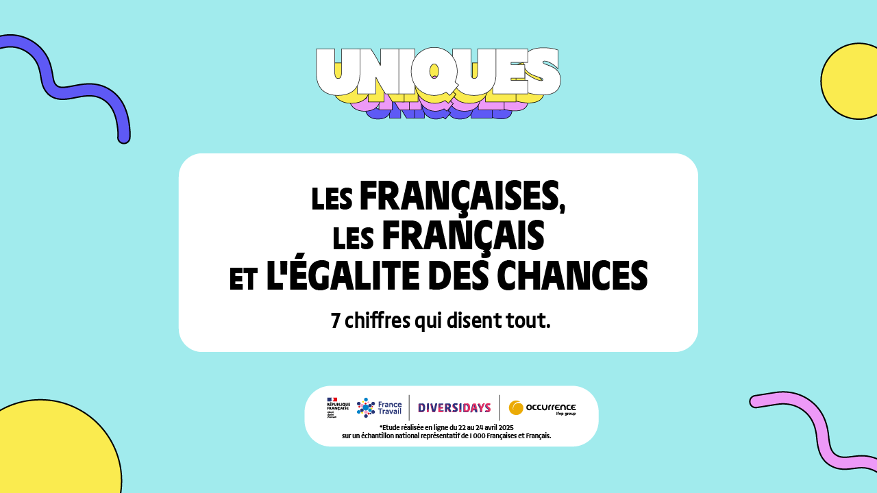 À l’occasion de la première édition du Festival UNIQUES, dédié à l’égalité des chances en France, Diversidays et France Travail publient une enquête nationale inédite sur la perception des Français à l’égard de l’égalité des chances, de l’inclusion et de la diversité. Réalisée par Occurrence – Groupe Ifop du 22 au 24 avril 2025, cette étude dresse un état des lieux lucide et instructif : entre résignation, fractures sociales persistantes et espoirs partagés d’un avenir plus juste.